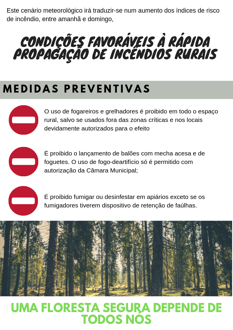 O Serviço Municipal de Proteção Civil e a Autoridade Nacional de Emergência e Proteção Civil (ANEPC) recomenda a adequação dos comportamentos e atitudes face à situação de perigo de incêndio rural, nomeadamente através da adoção das necessárias medidas de prevenção e precaução, na utilização do fogo em espaços rurais, observando as restrições em vigor e tomando especial atenção à evolução do perigo de incêndio para os próximos dias, disponível junto dos sítios da internet da ANEPC e do IPMA, junto da Câmara Municipal e dos Corpos de Bombeiros.