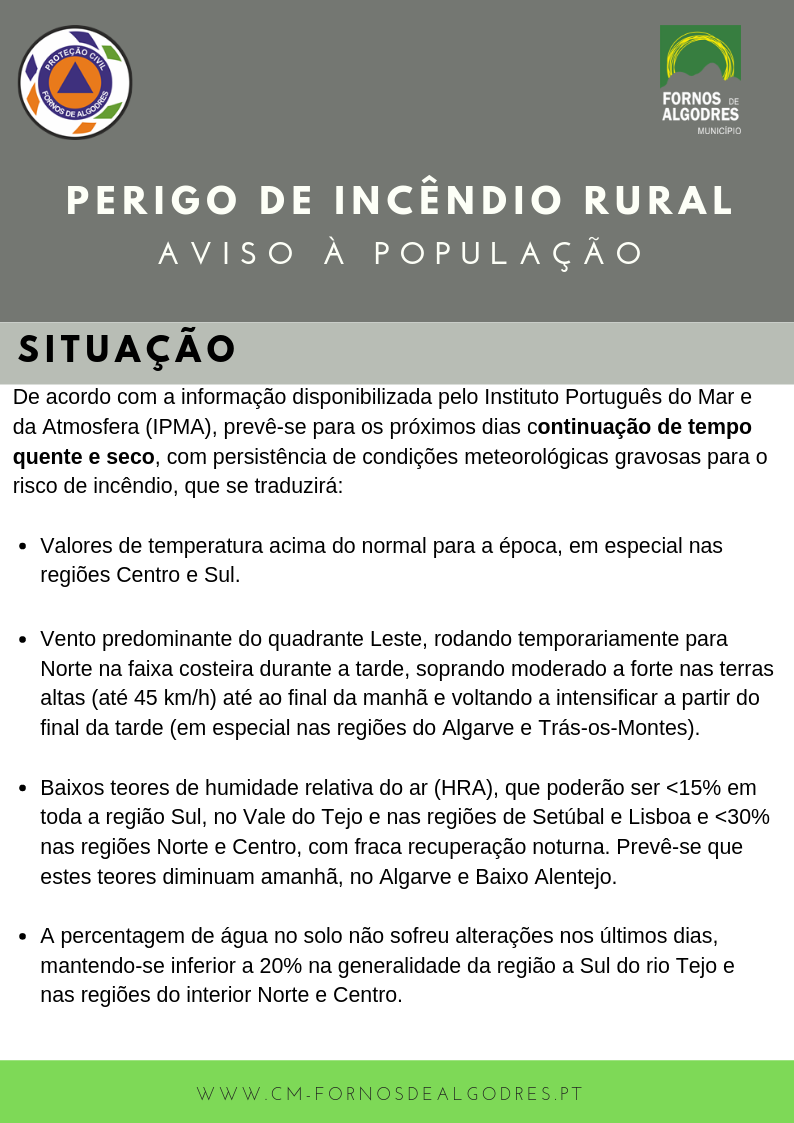De acordo com a informação disponibilizada pelo Instituto Português do Mar e da Atmosfera (IPMA), prevê-se para os próximos dias a continuação de tempo quente e seco, com persistência de condições meteorológicas gravosas para o risco de incêndio, que se traduzirá: